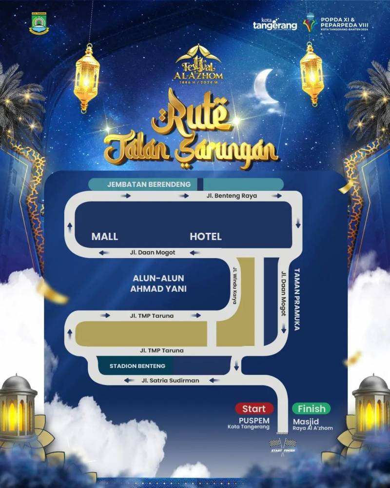 Semarak Festival Al-A’zhom ke-11 2024 Kota Tangerang terus digelorakan. Akhir pekan ini, Pemerintah Kota (Pemkot) Tangerang akan menggelar Jalan Sarungan pada Minggu, 14 Juli 2024, pukul 06.00-11.00 WIB.