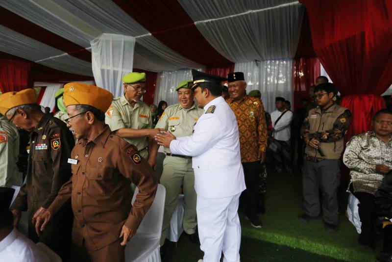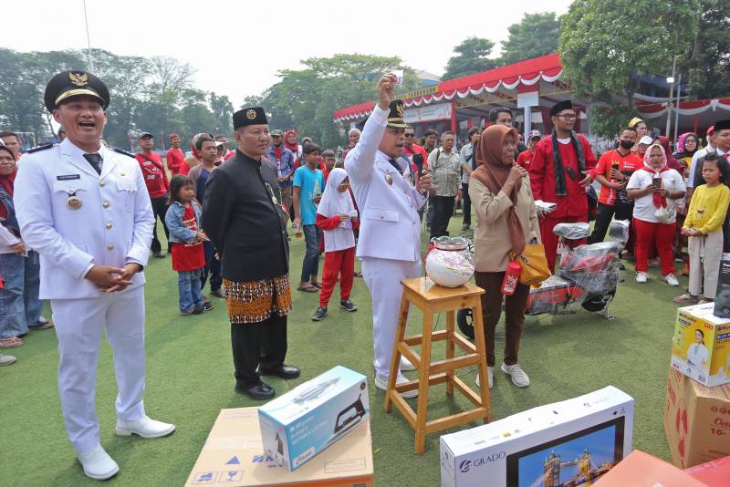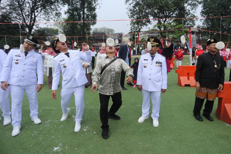 Usai mengikuti Upacara Peringatan HUT Ke -79 RI, Pj Wali Kota, turut menyerahkan penghargaan kesehatan, meninjau dan mengikuti perlombaan makan kerupuk gantung, yang ada di Alun-Alun Ahmad Yani.