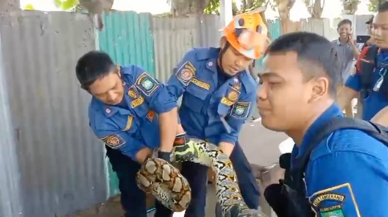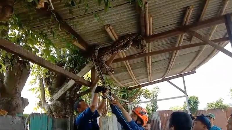 “Saat dievakuasi, ular dengan berat 30 kilogram itu tengah terlilit pada kayu penyangga. Kondisinya cukup agresif dan sempat membuat petugas kesulitan melakukan evakuasi. Dalam prosesnya petugas menggunaan penjapit dan kemudian dililit lakban agar tidak menyerang petugas,” jelas Gufron.