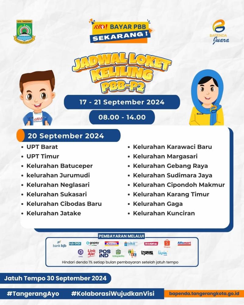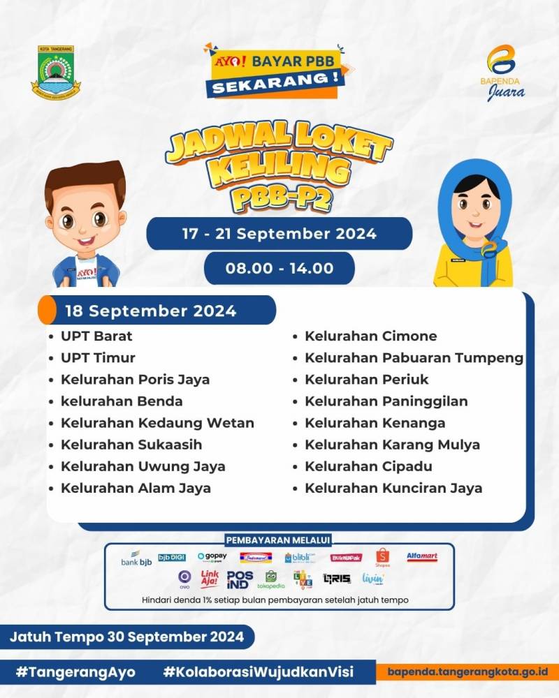 Pemerintah Kota (Pemkot) Tangerang melalui Badan Pendapatan Daerah (Bapenda) menggelar Loket Keliling PBB-P2 di tiap kelurahan dan kecamatan di Kota Tangerang dari 17 hingga 21 September 2024.