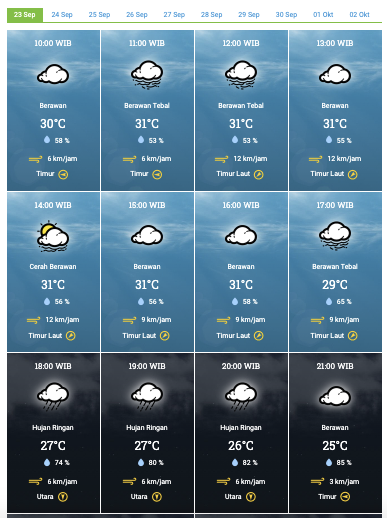 Selasa: Diprakirakan cerah berawan di pagi, berawan tebal di siang, hujan ringan di sore dan kembali berawan tebal di malamnya.