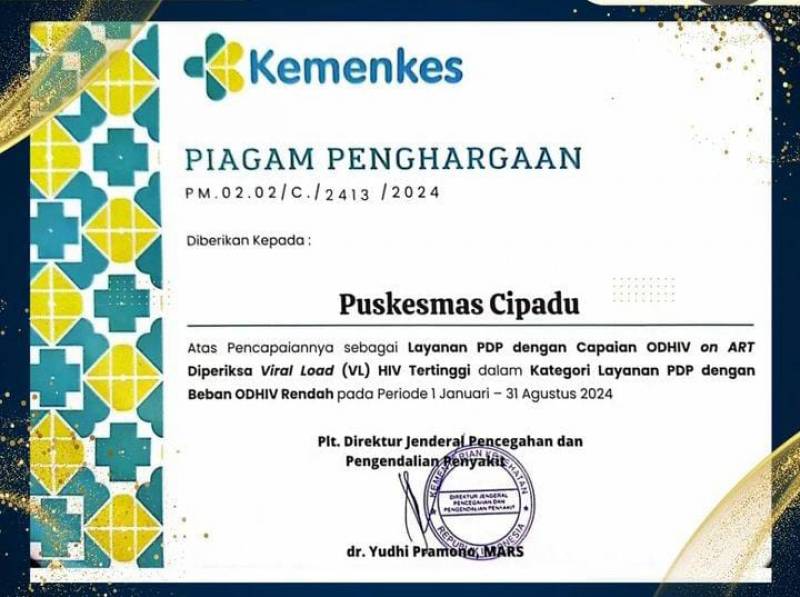 Kementerian Kesehatan Republik Indonesia (Kemenkes) RI mengapresiasi Pemerintah Kota Tangerang dalam hal ini Puskesmas Cipadu, Kecamatan Larangan atas Layanan PDP dengan capaian ODHIV on ART Diperiksa Viral Load (VL) HIV tertinggi dalam Kategori Layanan PDP dengan Beban ODHIV Rendah pada Periode 1 Januari- 31 Agustus.