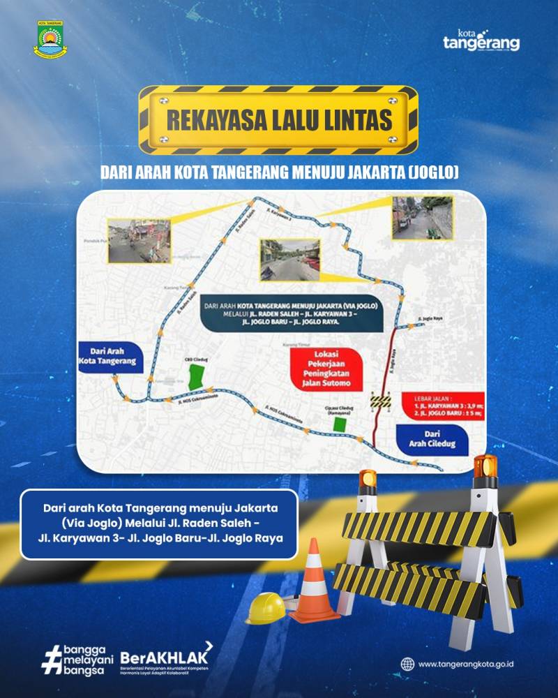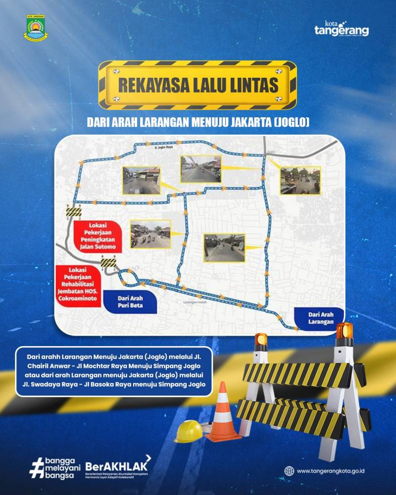 Pemerintah Kota (Pemkot) Tangerang mulai melakukan skema rekayasa lalu lintas di sekitar lokasi pengerjaan peningkatan infrastruktur di Jalan Dr. Sutomo Karang Tengah dan Jembatan Sasak Rembaga (Puribeta) di Jalan HOS Cokroaminoto Ciledug.