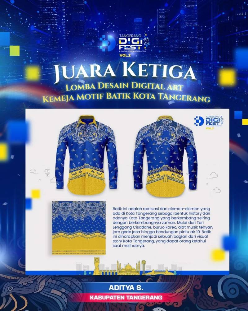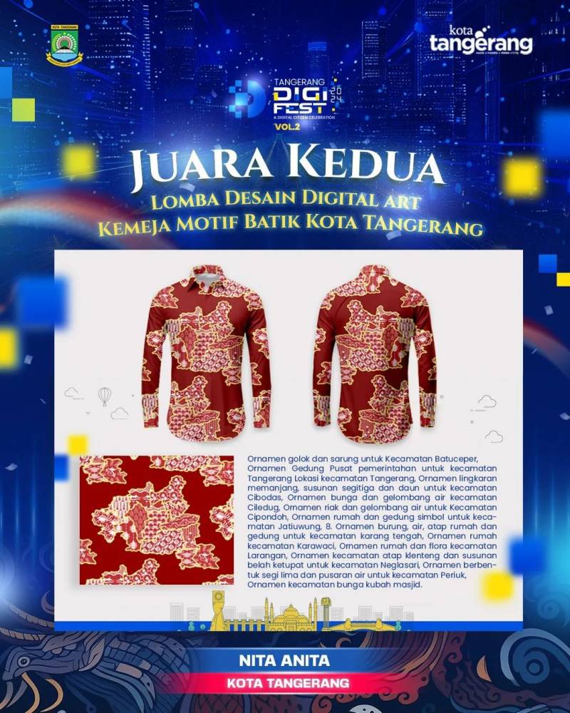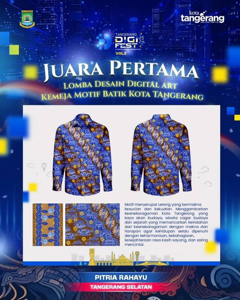 Pemerintah Kota (Pemkot) Tangerang melalui Dinas Komunikasi dan Informatika (Diskominfo) menggelar Lomba Desain Digital Art Kemeja Motif batik Kota Tangerang dengan total hadiah Rp27 juta pada event Tangerang Digital Festival Vol.2. Setelah melalui penilaian panjang, kini tiga pemenang telah diumumkan.