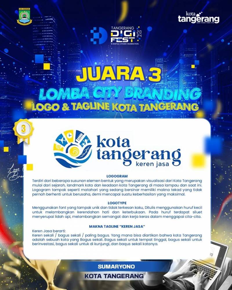 Kepala Diskominfo Kota Tangerang Indri Astuti mengumumkan, Juara III Lomba City Branding Logo dan Tagline Kota Tangerang adalah Sumaryono dari Kota Tangerang. Logo yang bernuansa biru kuning berbentuk lingkaran seperti matahari dengan beberapa susunan elemen bentuk yang merupakan visualisasi dari Kota Tangerang.