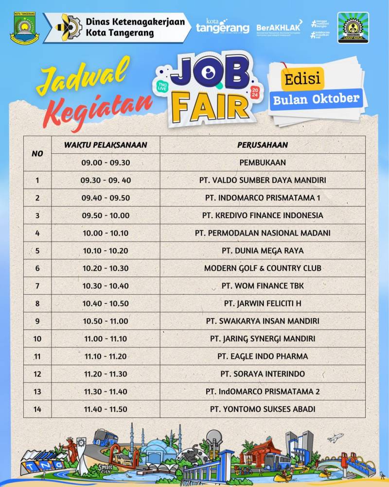 Kepala Dinas Ketenagakerjaan (Disnaker) Kota Tangerang Ujang Hendra Gunawan menuturkan, Job Fair Virtual kali ini akan berkolaborasi dengan 14 perusahaan ternama di Kota Tangerang. Seperti Eagle Indo Pharma, Permodalan Nasional Madani, WOM Fintech dan sebagainya. Job Fair Virtual ini akan diselenggarakan pukul 09.00 WIB-selesai pada Rabu 30 Oktober 2024.