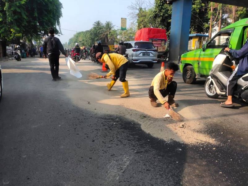 Ia pun menjelaskan, penanganan dilakukan secara simultan. Yakni, DPUPR dengan menebar pasir di seluruh tumpahan oli, lalu BPBD melakukan penyemprotan, DLH dengan petugas kebersihannya membantu proses pembersihan jalan.