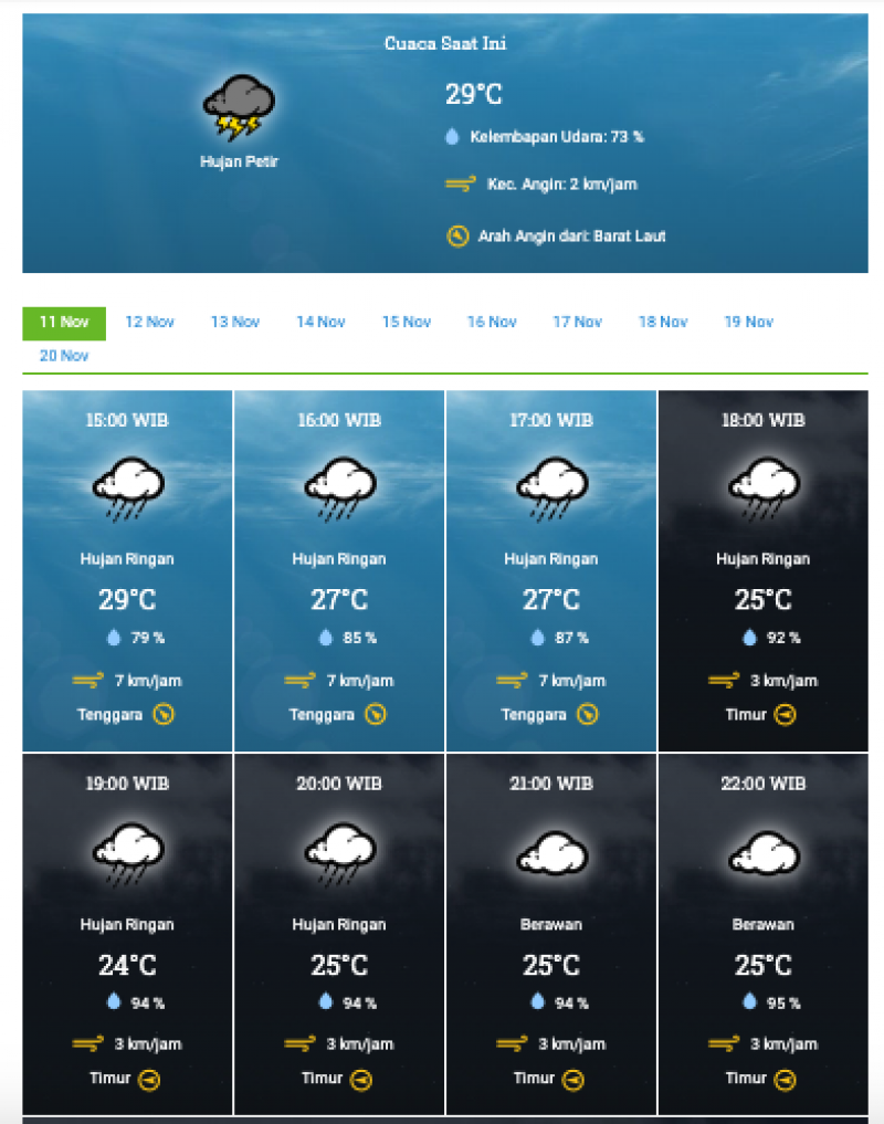 Rabu: Diprakirakan pagi cerah bawaran, siang hujan ringan, dan sore hingga malam cerah berawan