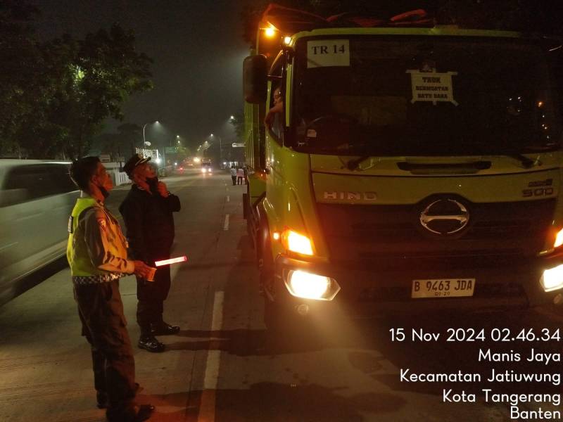Dalam upaya menjaga keamanan, ketertiban dan kelancaran lalu lintas, petugas gabungan intens melakukan pengawasan operasional truk tanah di Kota Tangerang. Salah satunya, terlihat di Pos Pantau Gabungan 3 Pilar, di Oasis Lestari Jalan Gatot Subroto, RT 03, RW 05, Kelurahan Jatake, Kecamatan Jatiuwung, Kota Tangerang, Jumat (15/11/24) dini hari.