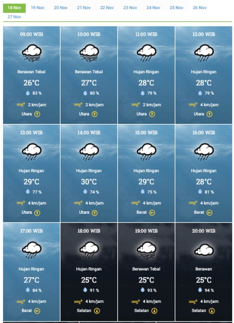Rabu: Diprakirakan berawan tebal hingga siang, hujan ringan di sore dan Kembali berawan tebal di malamnya.