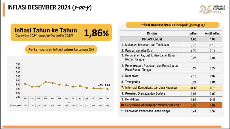 “Kami baru saja merilis indeks inflasi terbaru, hasilnya sangat memuaskan, tahun baru ini disambut dengan capaian penurunan inflasi yang stabil, bahkan hanya mencapai 1,86 persen saja disertai Indeks Harga Konsumen (IHK) sebesar 106,46,” ujar Ruta, Kamis (2/1/25).