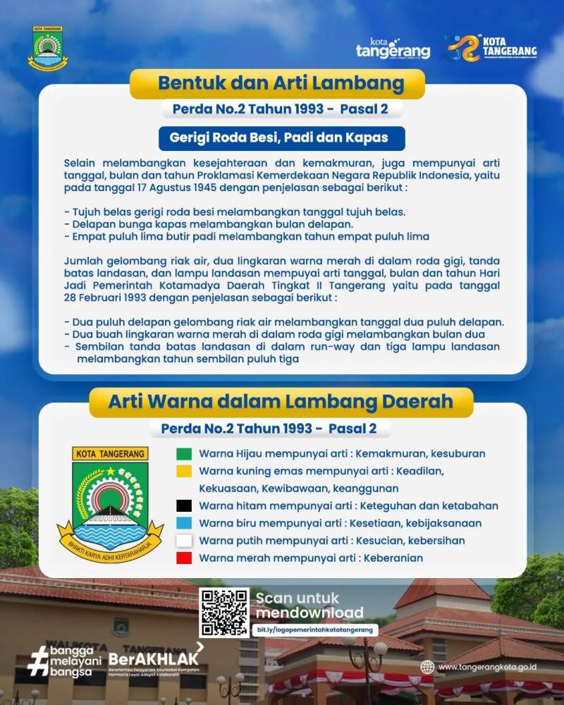 Berdasarkan peraturan daerah Kota Madya daerah tingkat II Tangerang Perda Nomor 2 Tahun 1993 Tentang Lambang Daerah Kota Madya Daerah Tingkat II Tangerang Pasal 2 yaitu: