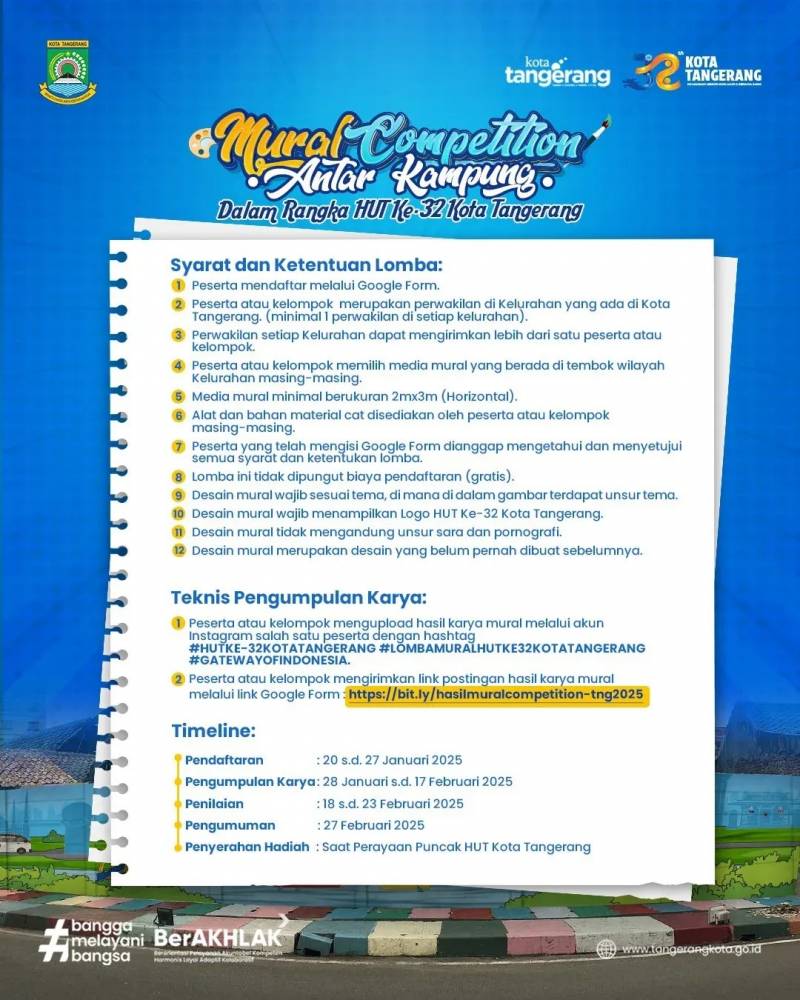 “Tunjukan kreativitas kalian dengan membuat mural di kampung masing-masing dengan tema HUT Ke-32 Kota Tangerang. Daftar sekarang juga di bit.ly/daftarmuralcompetition-tng202,” seru Ian, Selasa (21/1/25).