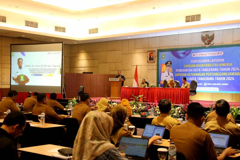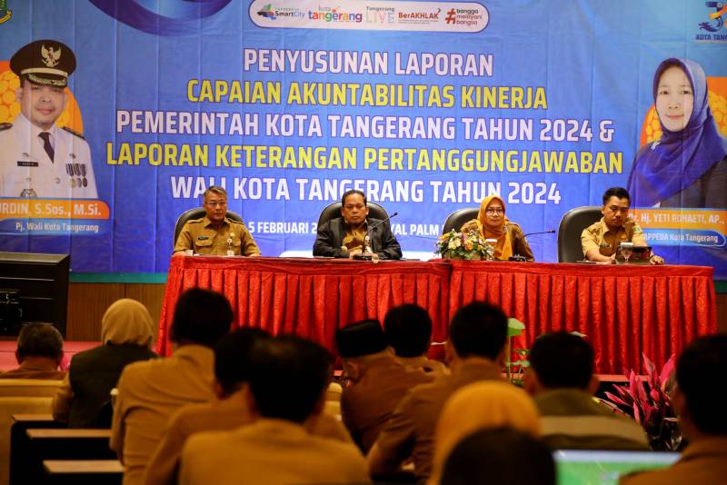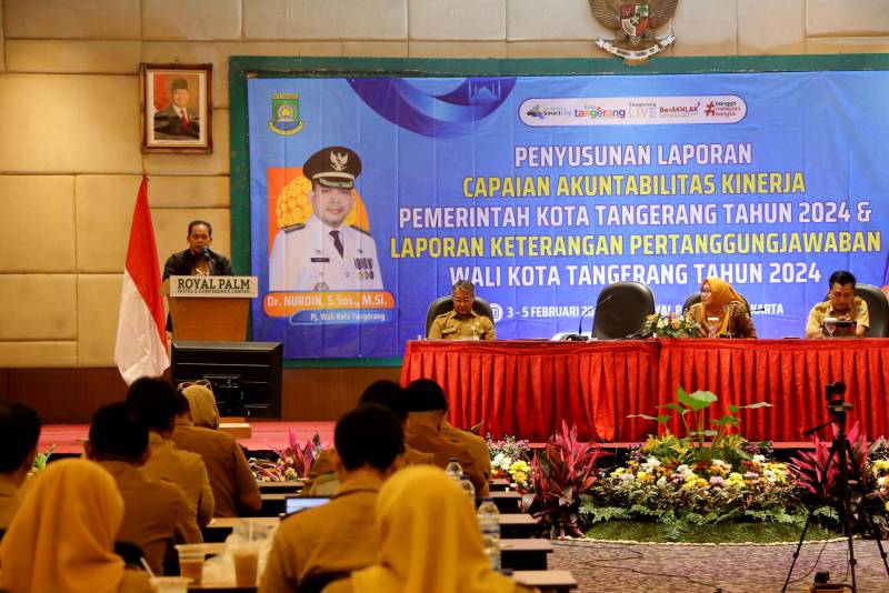Penjabat (Pj) Wali Kota Tangerang, Dr. Nurdin, membuka kegiatan Penyusunan Laporan Capaian Akuntabilitas Kinerja Pemerintah Kota (Pemkot) Tangerang Tahun 2024 serta Laporan Keterangan Pertanggungjawaban (LKPj) Wali Kota Tangerang Tahun 2024. Kegiatan ini berlangsung di Hotel Palm Royal, Jakarta Barat, Senin (3/2/2025).