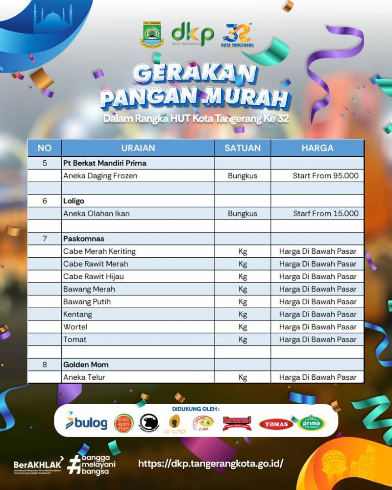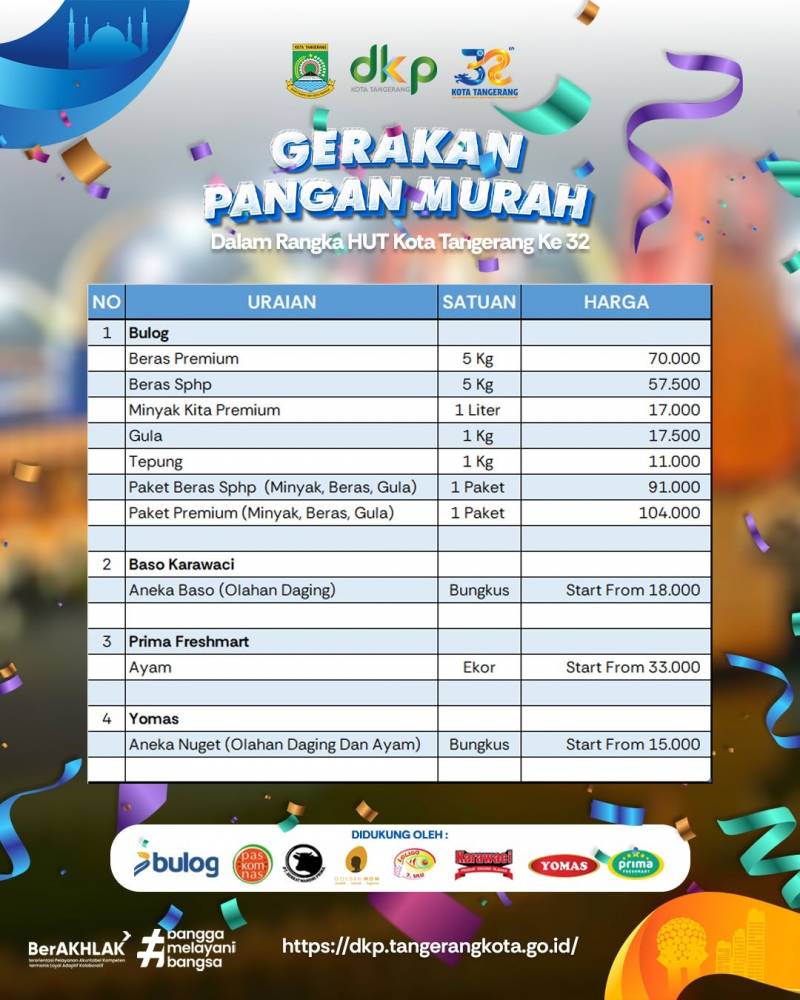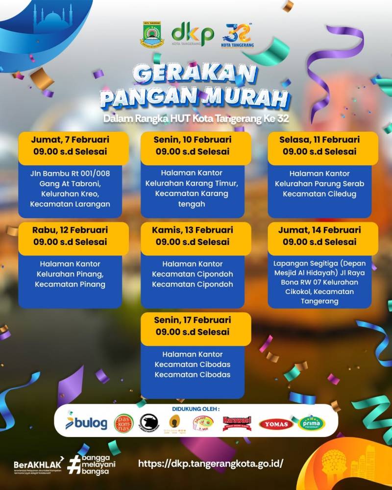 Dalam rangka Hari Ulang Tahun (HUT) Ke-32 Kota Tangerang, Pemerintah Kota (Pemkot) Tangerang melalui Dinas Ketahanan Pangan (DKP) akan menggelar Gerakan Pangan Murah (GPM) di 13 kecamatan secara berkala, mulai 7 hingga 25 Februari mendatang.