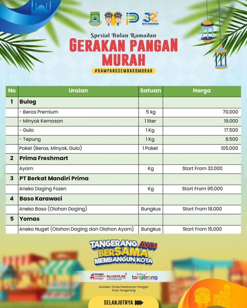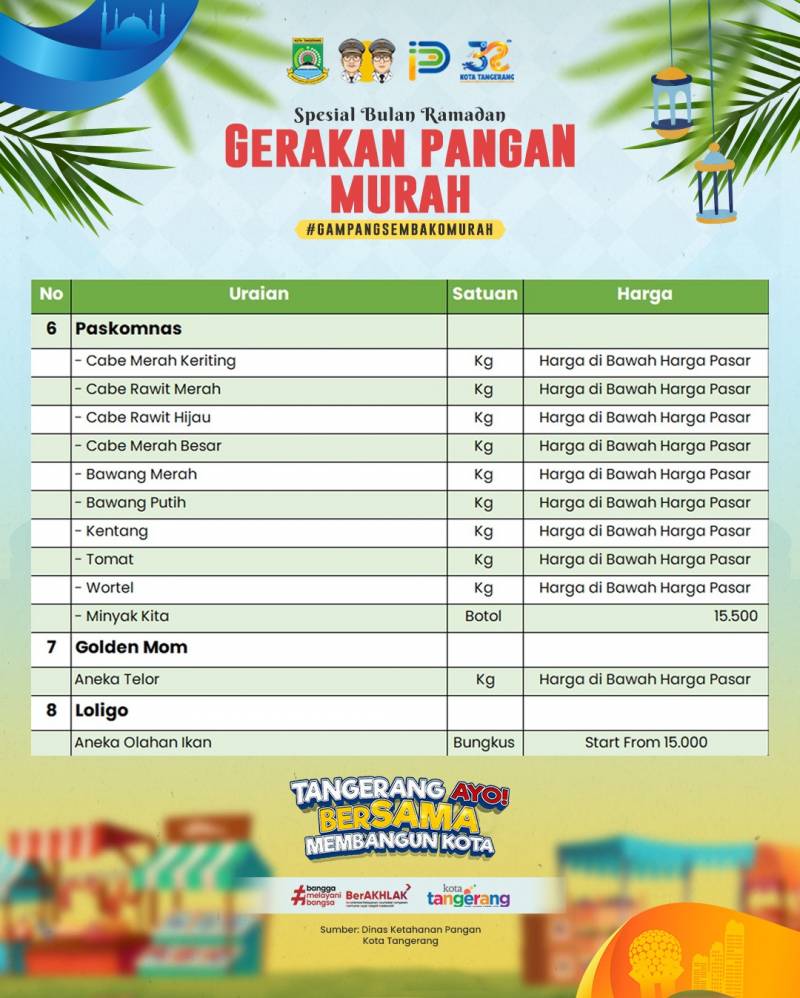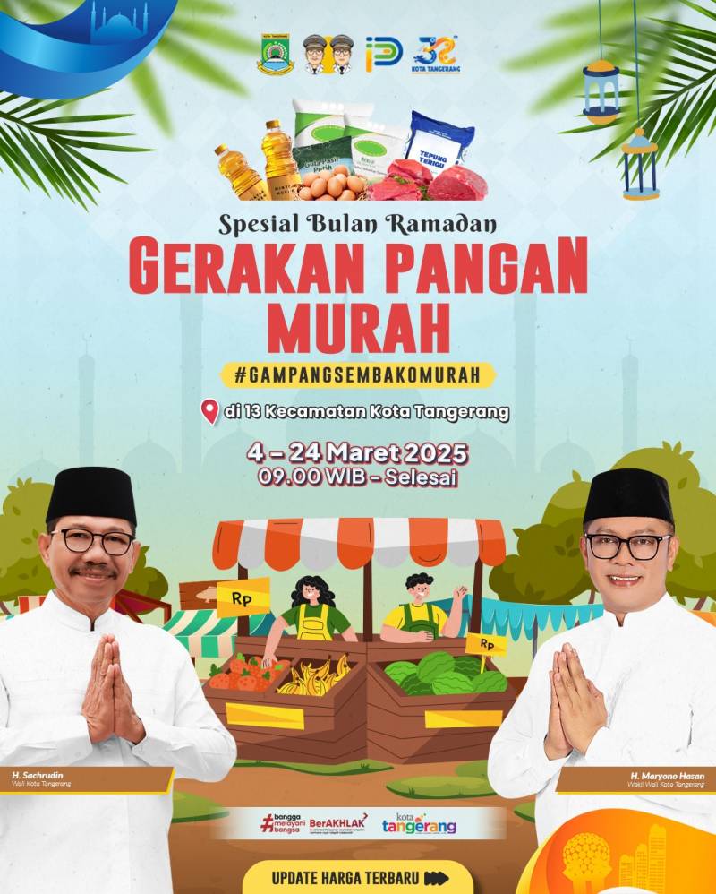 Wakil Wali Kota Tangerang, H. Maryono Hasan, menyampaikan, Pemerintah Kota (Pemkot) Tangerang berkomitmen untuk terus memberikan kemudahan bagi masyarakat untuk memenuhi berbagai kebutuhan pokoknya khususnya di Bulan Ramadan. Melalui Gerakan Pangan Murah (GPM) Edisi Ramadan yang dilaksanakan di 13 kecamatan, masyarakat Kota Tangerang dapat memperoleh sembako dengan mudah dan murah di Bulan Ramadan mulai tanggal 4-24 Maret 2025.