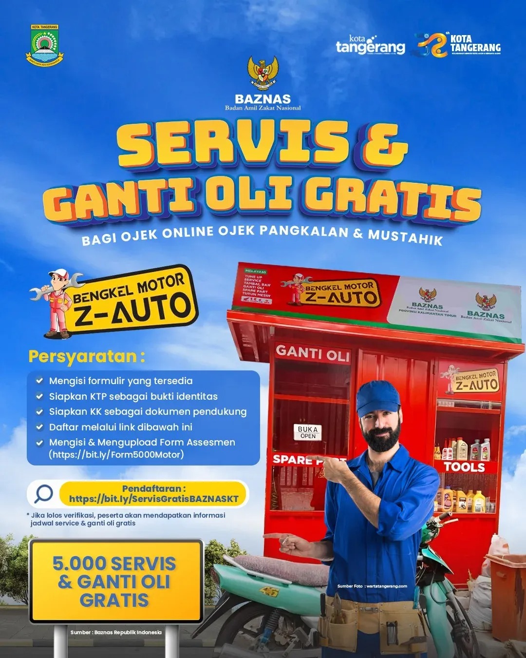 Semarak bulan suci Ramadan 1446 Hijriah, Badan Amil Zakat Nasional (BAZNAS) menyediakan layanan servis dan ganti oli gratis di berbagai daerah, termasuk di Kota Tangerang, mulai 17-23 Maret 2025.