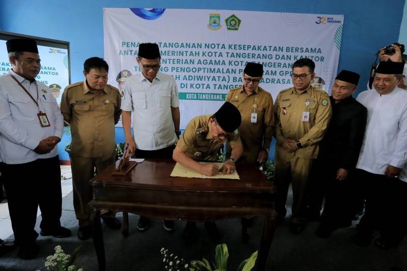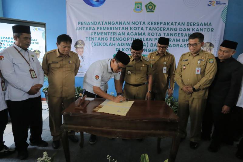 Penandatanganan dilakukan oleh Wali Kota Tangerang, H. Sachrudin, didampingi Wakil Wali Kota, H. Maryono, dan Kepala Kantor Kemenag Kota Tangerang, H. Samsudin, di Madrasah Ibtidaiyah (MI) Al-Mubarok, Kecamatan Pinang, Kelurahan Panunggangan Barat, pada Selasa (22/04/2025).