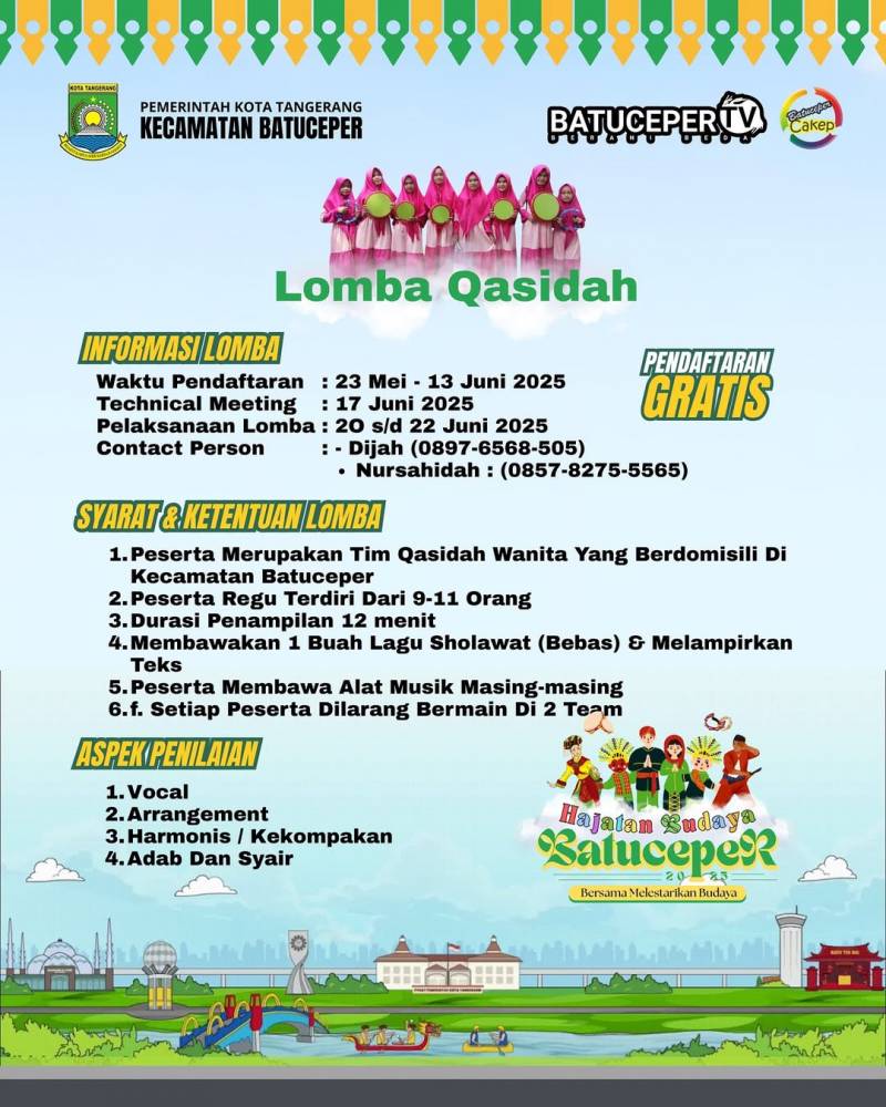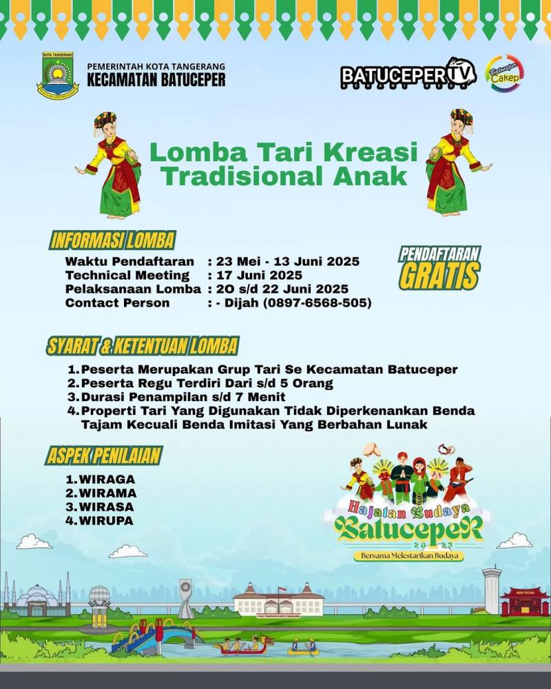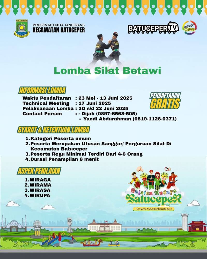 Dalam rangka melestarikan budaya dan mempererat tali persaudaraan antarwarga, Kecamatan Batuceper akan menggelar Hajatan Budaya Batuceper 2025 pada 20-22 Juni mendatang, di Taman Embung Batusari, Kota Tangerang.