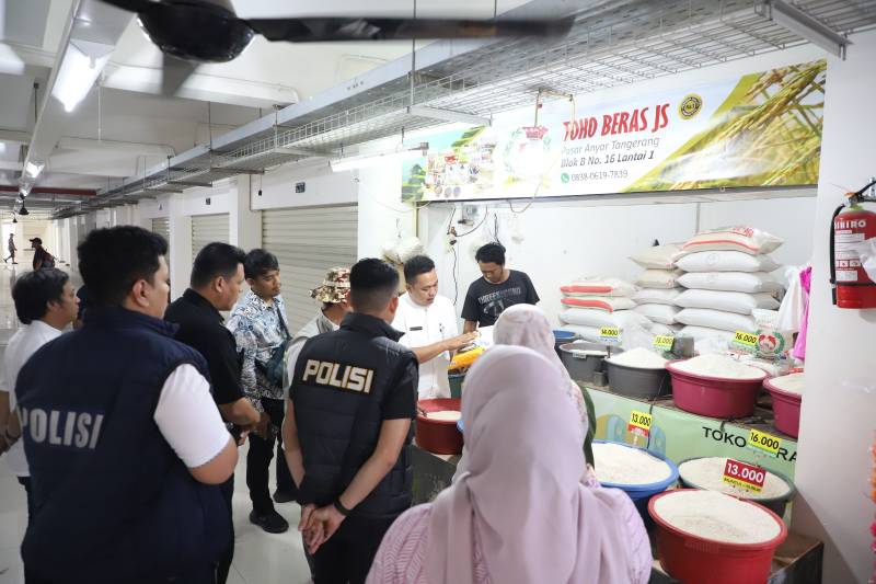 Antisipasi peredaran beras oplosan, tim gabungan dari Pemerintah Kota Tangerang bersama instansi terkait menggelar inspeksi mendadak (sidak) ke sejumlah pasar tradisional di Kota Tangerang, Jumat (25/7/25).