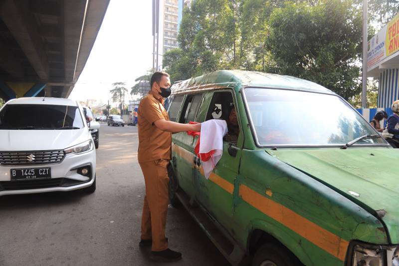 Dalam rangka menyemarakkan Hari Ulang Tahun (HUT) ke-80 Kemerdekaan Republik Indonesia, Dinas Komunikasi dan Informatika (Diskominfo) Kota Tangerang menggelar aksi membagikan Bendera Merah Putih kepada para pengendara yang melintas di lampu merah perempatan PLN Kota Tangerang, Selasa (5/8/25).
