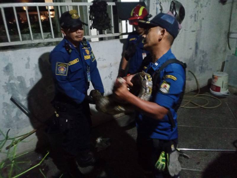 Sebanyak lima personel Regu 3 UPT Damkar Ciledug diterjunkan dan berhasil menangkap seekor ular jenis sanca yang memiliki panjang tiga meter dan bobot 30 kilogram, yang sedang berada di halaman rumah.