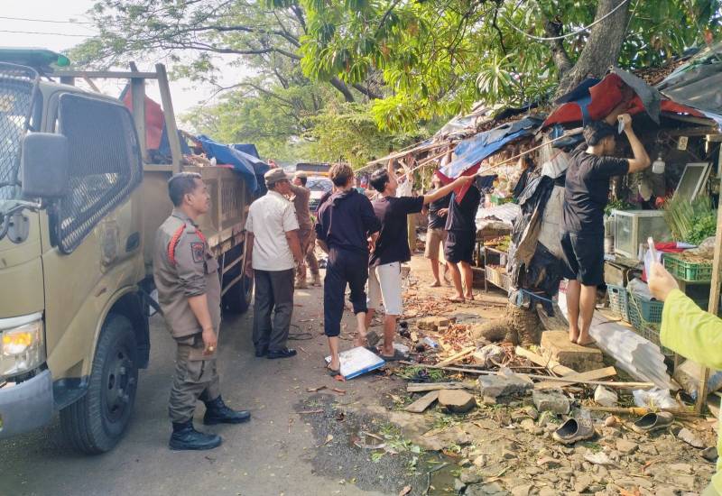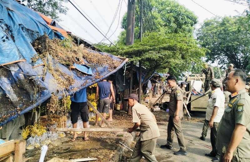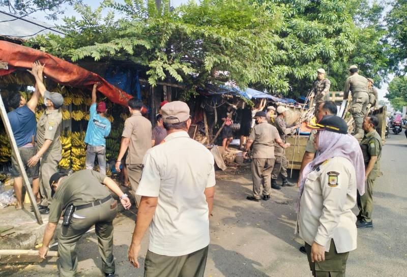 Mengembalikan fungsi fasilitas umum berupa trotoar untuk pejalan kaki, petugas gabungan dari unsur Satuan Polisi Pamong Praja (Satpol PP) Kota Tangerang, Trantib Kecamatan Ciledug dibantu aparat TNI-Polri menertibkan puluhan lapak pedagang kaki lima (PKL) di sepanjang Jalan Raden Fatah, Kecamatan Ciledug, Rabu (06/08/25).