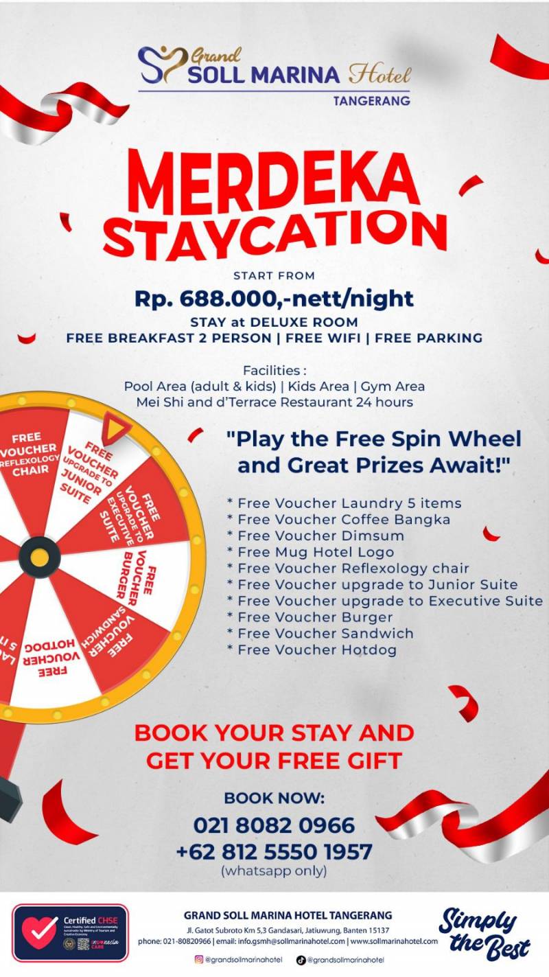 Turut memeriahkan Hari Ulang Tahun (HUT) ke-80 Republik Indonesia, Grand Soll Marina Hotel Kota Tangerang menghadirkan promo istimewa untuk para tamu yang ingin merayakan momen spesial tersebut bersama keluarga maupun kerabat. Terdapat dua promo yaitu Merdeka Staycation dan Merdeka Package.
