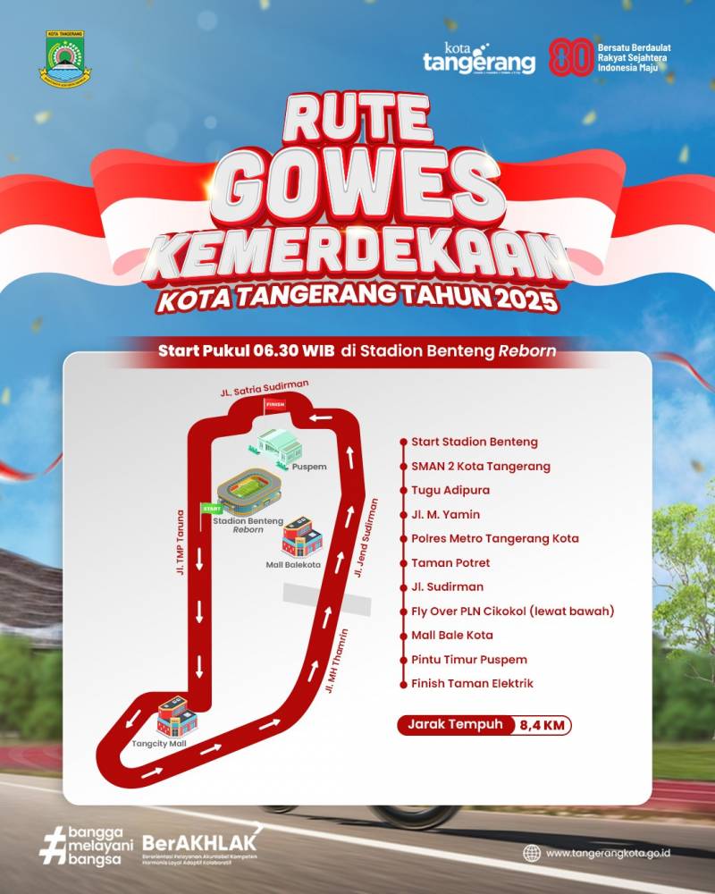 Dalam rangka menyemarakkan Hari Kemerdekaan Republik Indonesia, Pemerintah Kota Tangerang akan menggelar acara Gowes Kemerdekaan Kota Tangerang 2025 di Stadion Benteng Reborn pukul 06.00 WIB, Minggu (24/8/25).