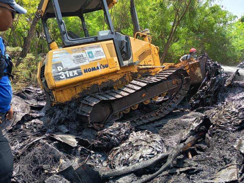 Kepala Bidang Kedaruratan dan Logistik BPBD Kota Tangerang Andia Suherlandia Rahman menuturkan, pihaknya baru saja mendatangkan bantuan dua alat berat dari Dinas PUPR Kota Tangerang untuk memastikan upaya pemadaman timbunan limbah karet berjalan lebih cepat.
