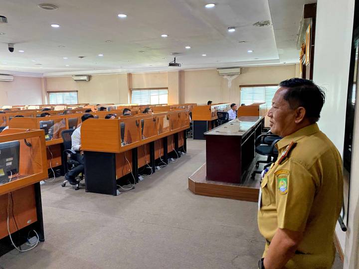 Sekretaris Daerah (Sekda) Kota Tangerang, Herman Suwarman, meninjau langsung pelaksanaan tes Computer Assisted Test (CAT) bagi calon pegawai Badan Layanan Umum Daerah (BLUD) di lingkungan Dinas Kesehatan Kota Tangerang, yang berlangsung di Gedung Cisadane, Senin (13/10/2025).