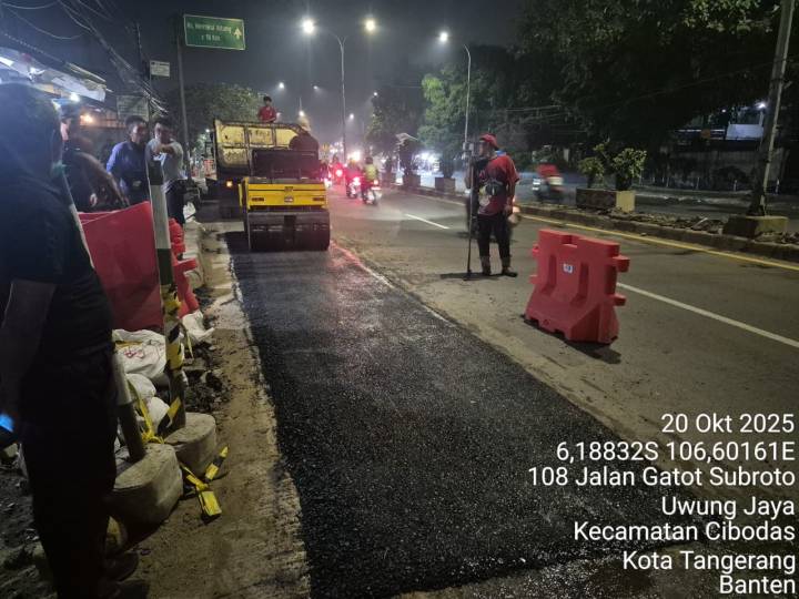 Perumda Tirta Benteng Kota Tangerang melakukan perbaikan jalan di sejumlah titik yang terdampak pekerjaan galian pipa jaringan distribusi air, di Jalan Gatot Subroto, Kota Tangerang, Senin (20/10) malam.