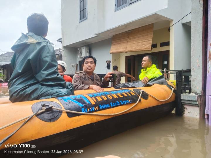 Petugas gabungan dari Tramtib Kecamatan Ciledug dan Polsek Ciledug bergerak cepat melakukan aksi penyelamatan di tengah kepungan banjir yang merendam Perumahan Puri Kartika Baru, Kelurahan Tajur, Kota Tangerang, Jumat (23/01/26).