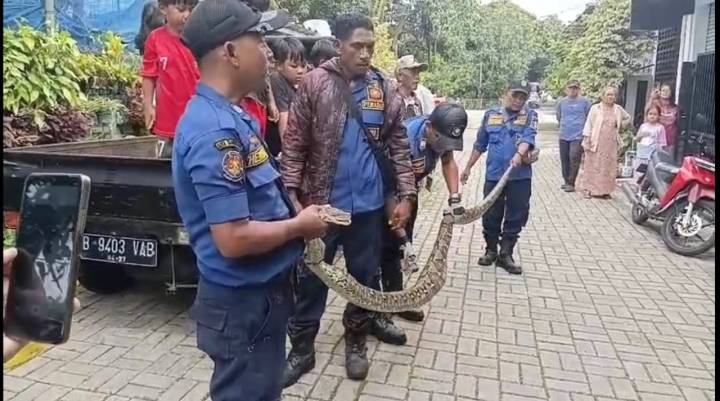 "Kami melakukan penanganan cepat dan berhasil menangkap seekor ular sanca sepanjang 4,1 meter dengan bobot mencapai 20 kilogram. Posisi ular berada di dekat kandang ayam di area depan komplek," ujar Agio.