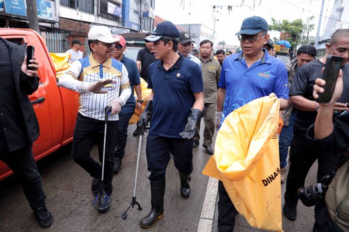 Wali Kota Tangerang, H. Sachrudin, mendampingi Menteri Lingkungan Hidup (LH), Hanif Faisol Nurofiq, dalam kegiatan kurve atau kerja bakti yang melibatkan unsur Forkopimda, jajaran pegawai, serta masyarakat sekitar.
