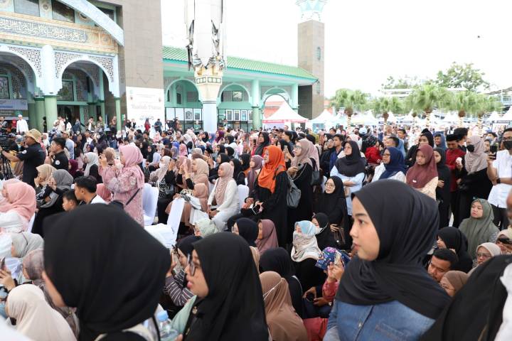 Sejak sore, ribuan warga tampak memadati kawasan Masjid Raya Al-A’zhom. Selain berburu kuliner dan menikmati suasana festival, pengunjung juga menantikan salah satu agenda paling dinanti, yakni penampilan hiburan dari penyanyi religi Alma Esbeye menjelang waktu berbuka puasa.