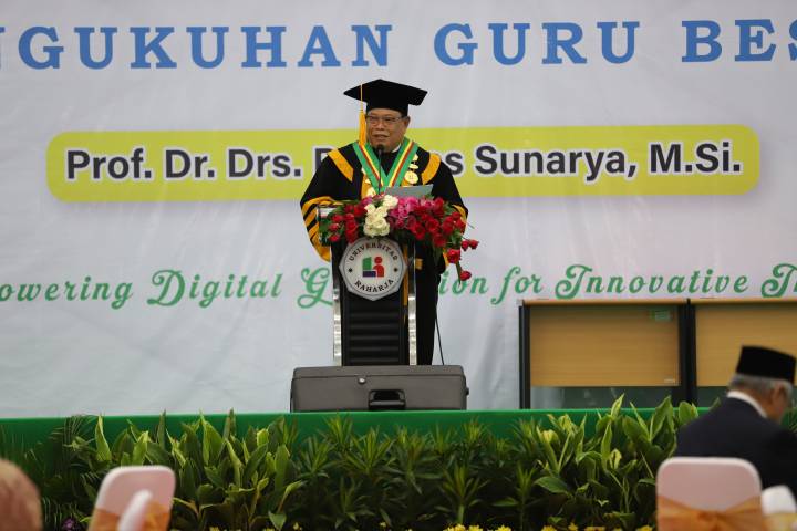 Di momen sama, Rektor Universitas Raharja Po Abas Sunarya juga dikukuhkan menjadi Guru Besar Universitas Raharja di usia yang tidak lagi muda.