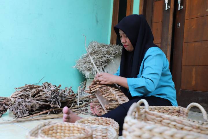 Selain eceng gondok, Ratu Eceng juga menunjukkan inovasinya dengan menyediakan kerajinan dari material pandan, pelepah pisang, dan rotan untuk memenuhi selera pasar internasional yang dinamis.