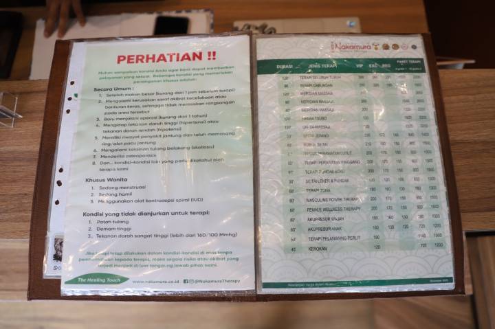 Dari sisi harga, Nakamura menawarkan variasi layanan yang cukup terjangkau. Paket terapi dimulai dari Rp100 ribu untuk seitai leher dan pundak, hingga Rp320 ribu untuk layanan premium di ruang VIP seperti hansa seitai dan ontai masaji.