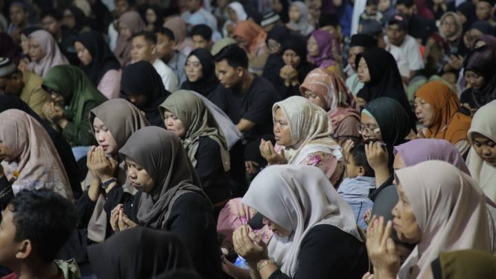 Suasana pengunjung Festival Maulid Nusantara 2, mendengarkan tausyiah Ustadz Maulana, di Taman Elektrik, Kota Tangerang, Provinsi Banten, Selasa (23/9/25).