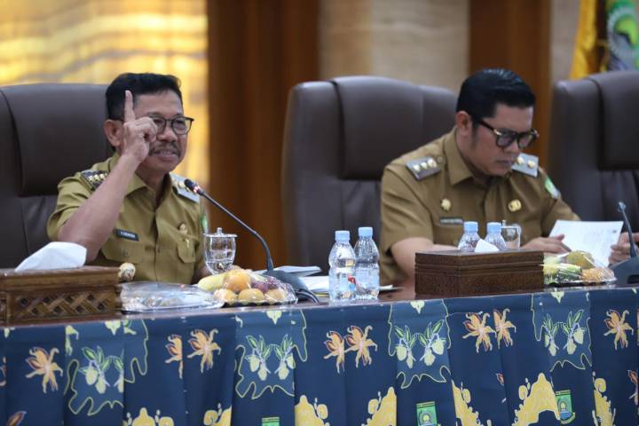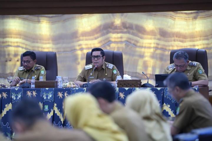 Wali Kota Tangerang Sachrudin memberikan arahan dalam Rapat Evaluasi Kewilayahan kepada seluruh peserta di Ruang Rapat Akhlakul Karimah, Kota Tangerang, Banten, Senin (6/10/25)
