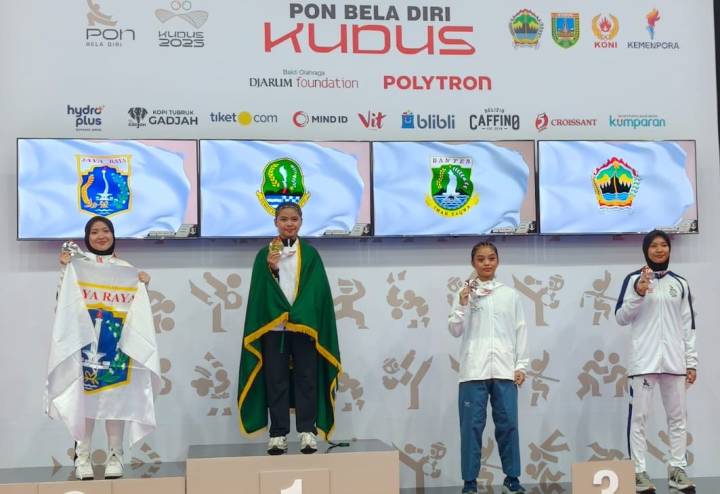 Peraih medali perunggu atlet taekwondo asal Kota Tangerang Salwa Aqila Berliana (dua dari kanan) yang mewakili Kontingen Provinsi Banten dalam PON Bela diri 2025, Kudus, Jawa Tengah.