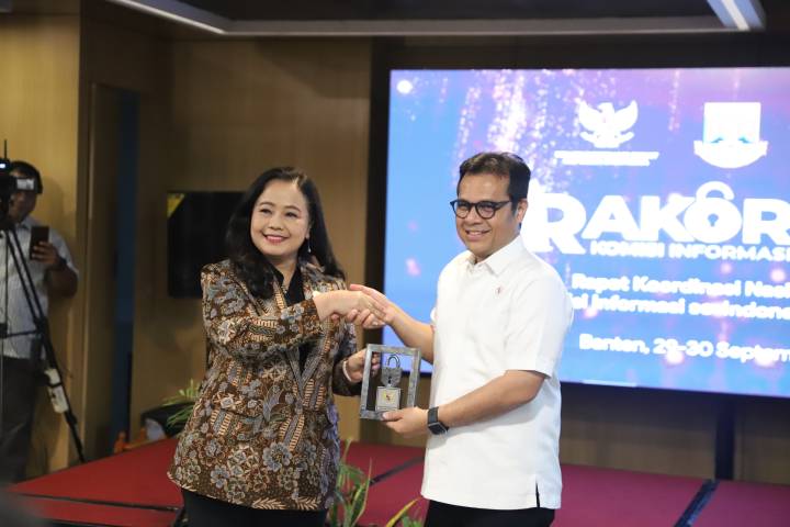 Wakil Menteri Komunikasi dan Digital (Komdigi) Nezar Patria (kanan) sedang menerima penghargaan di Acara Rapat Koordinasi Nasional Komisi Informasi di Hotel Mercure, Kota Tangerang, Senin (29/9/25).