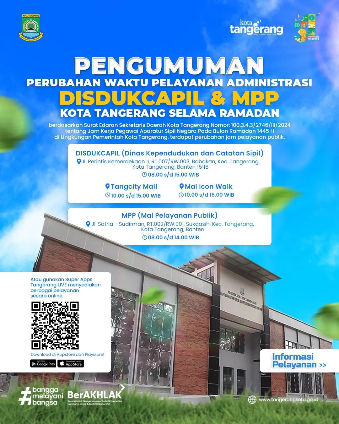 Berdasarkan Surat Edaran Sekretaris Daerah Kota Tangerang Nomor: 100.3.4.3/2746/III/2024 tentang Jam Kerja Pegawai Aparatur Sipil Negara Pada Bulan Ramadan 1445 H...