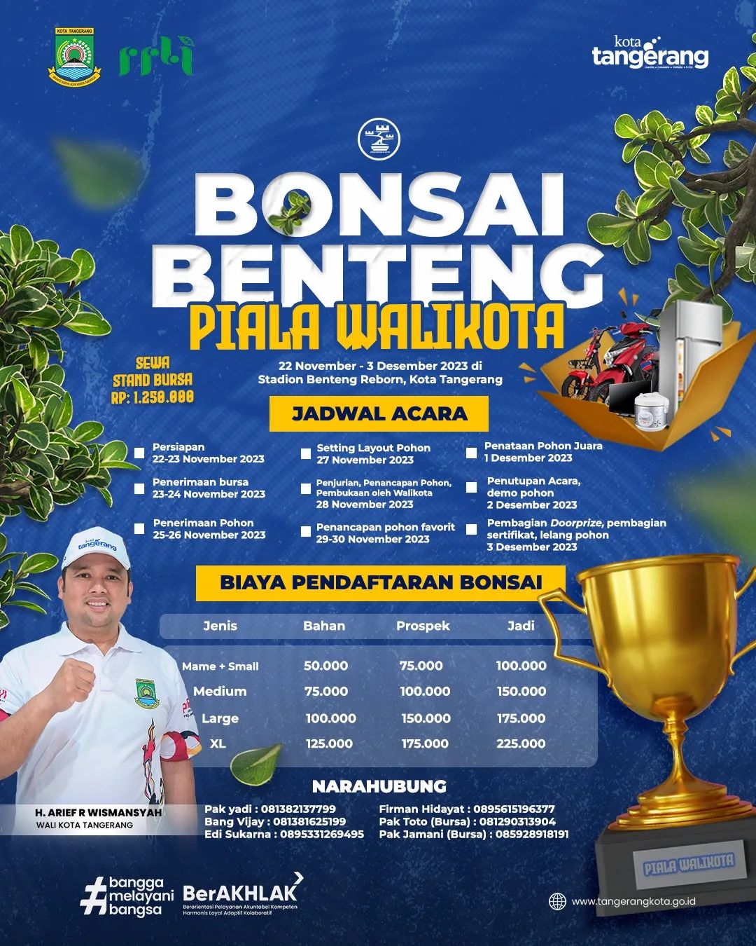 Ayo saksikan dan ikuti kontes Bonsai Benteng Piala Walikota yang diselenggarakan pada tanggal 22 November - 3 Desember 2023 di Stadion Benteng Reborn...