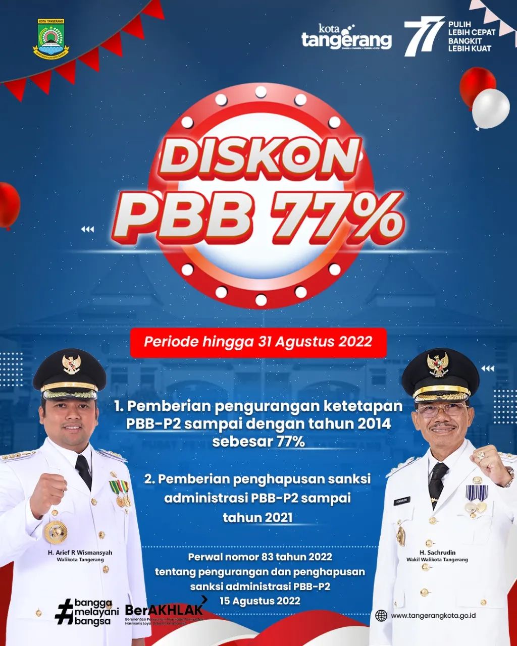Demi menyemarakan Kemerdekaan Republik Indonesia, Badan Pendapatan Daerah Kota Tangerang memberikan pengurangan ketetapan sebesar 77% Pajak Bumi & Bangunan...