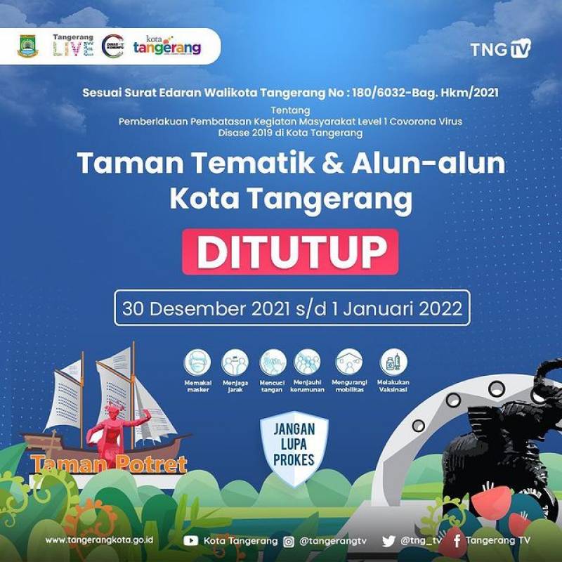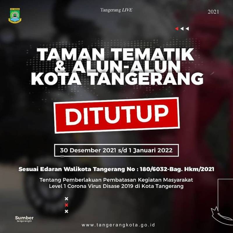 Berdasarkan Surat Edaran Walikota Tangerang No.180/6032-Bag.Hkm/2021, Taman Tematik dan Alun-alun Kota Tangerang ditutup mulai 30 Desember 2021 s/d. Januari...